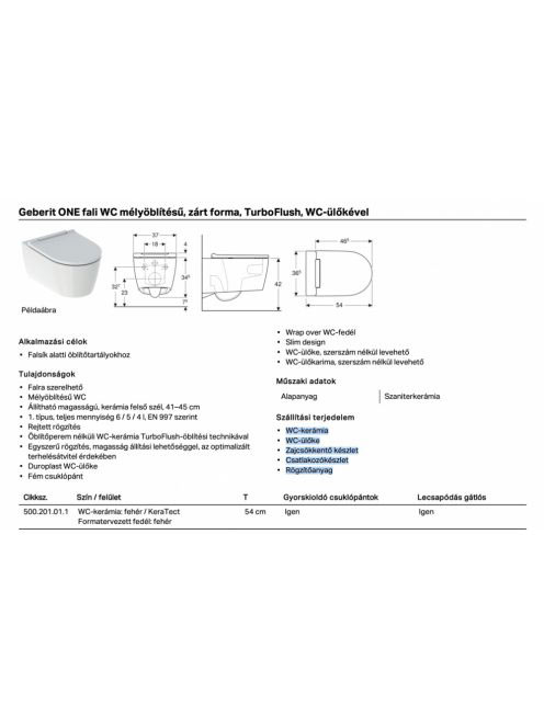 Geberit ONE TurboFlush fali WC 37x54 cm, ülőkével, fehér design takarólappal 500201011 (500.201.01.1)